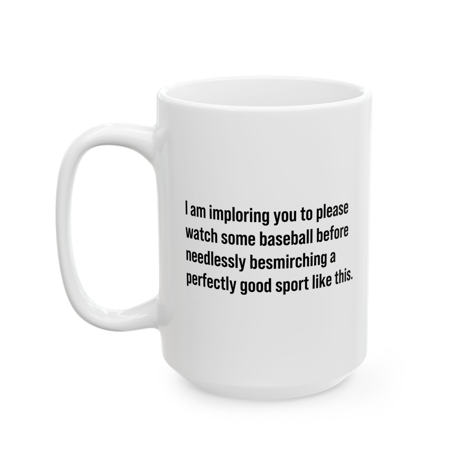 Start conversations with this funny baseball mug featuring the quote: “I am imploring you to please watch some baseball before needlessly besmirching a perfectly good sport like this.” Perfect for baseball fans who love witty sports humor and clever quotes. This baseball fan mug is great for coffee, tea, or game-day drinks and makes a fun gift for baseball lovers, sports fans, and anyone who enjoys sarcastic sports humor.